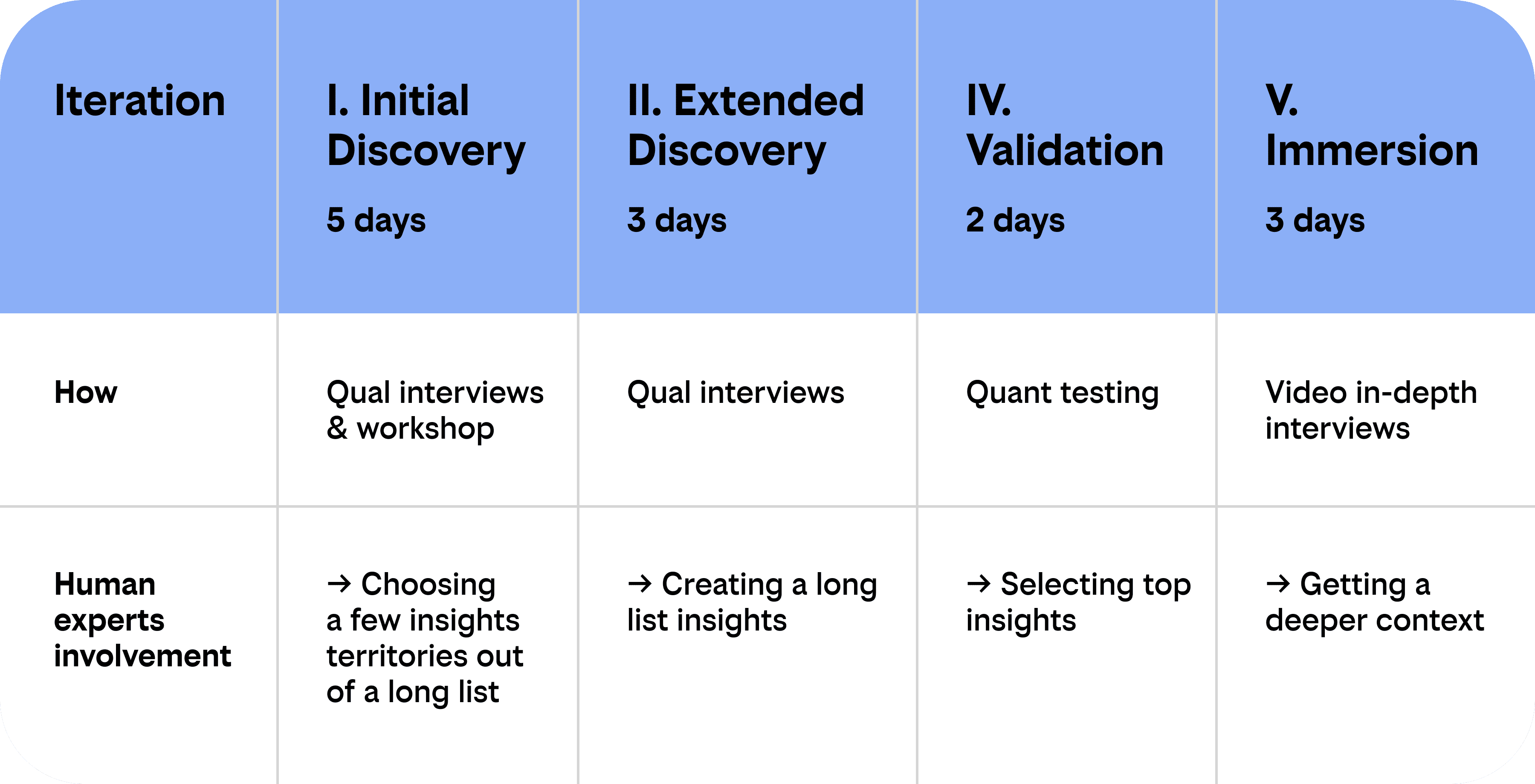 At Yasna, we treat iterative methodology as part of quality assurance. Instead of trying to solve everything in one long linear study, we run research in several focused stages.