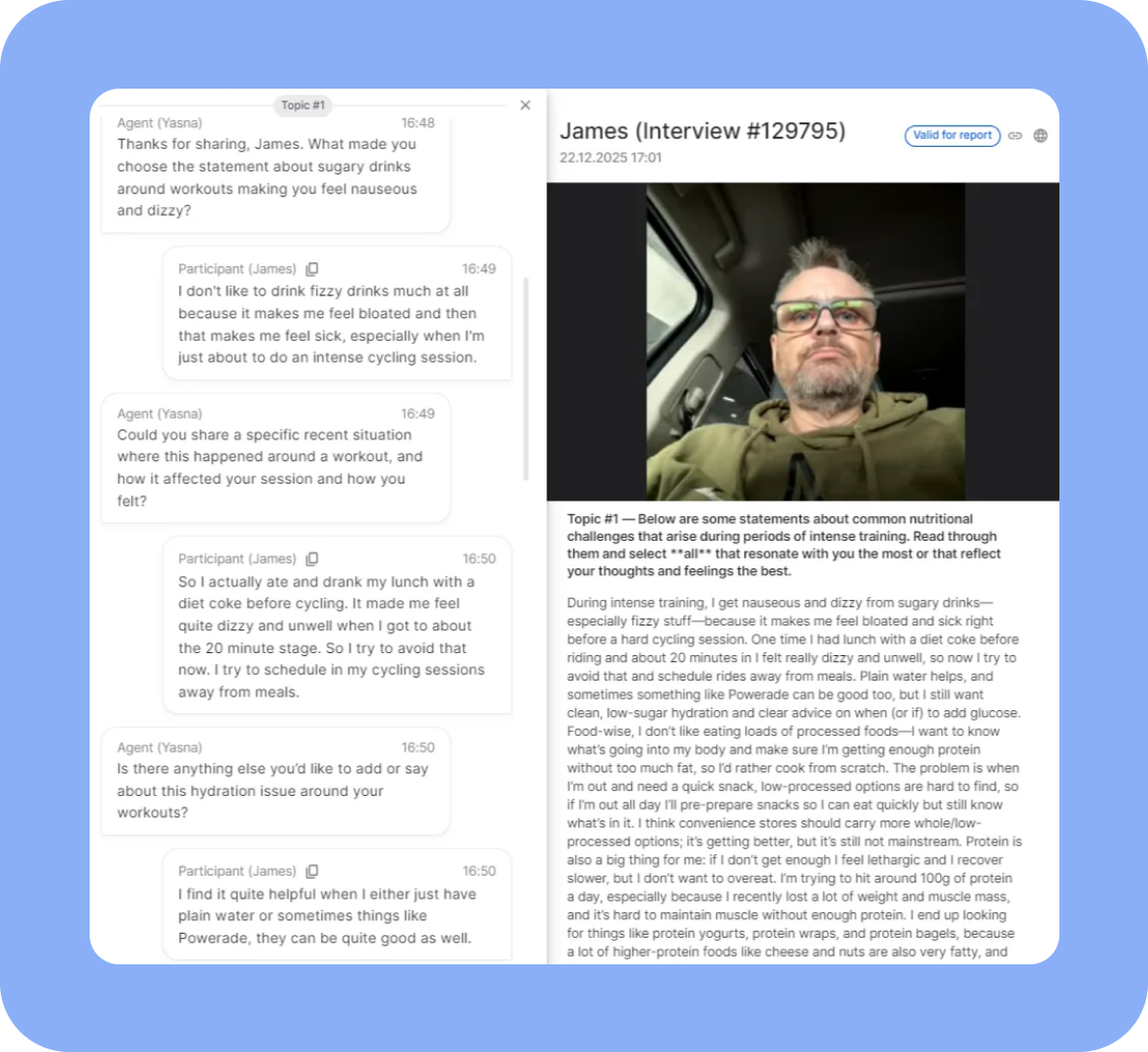 This isn’t a one-size-fits-all script. Our AI dynamically adapts to each person. It probes deeper on interesting points, clarifies vague statements, and adjusts its tone based on the participant’s level of engagement.