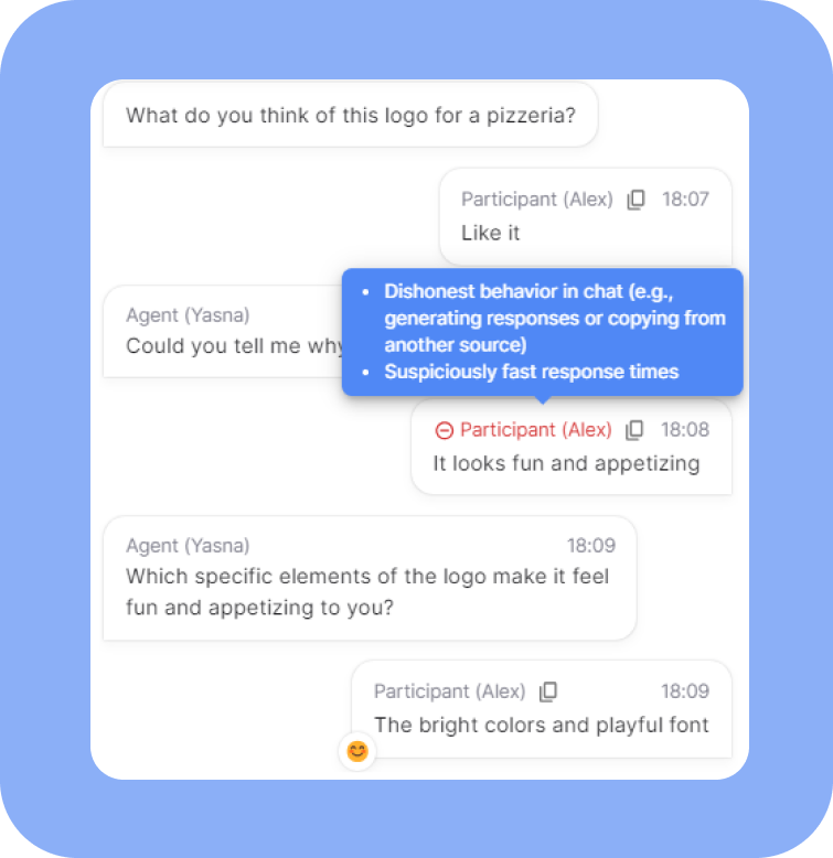 Together, these allow us to flag suspicious interviews with high confidence. Where a bot slips through a traditional survey undetected, on yasna.ai, its activity is visible, traceable, and excluded. We provide technical proof of quality, not just promises.